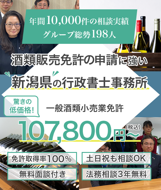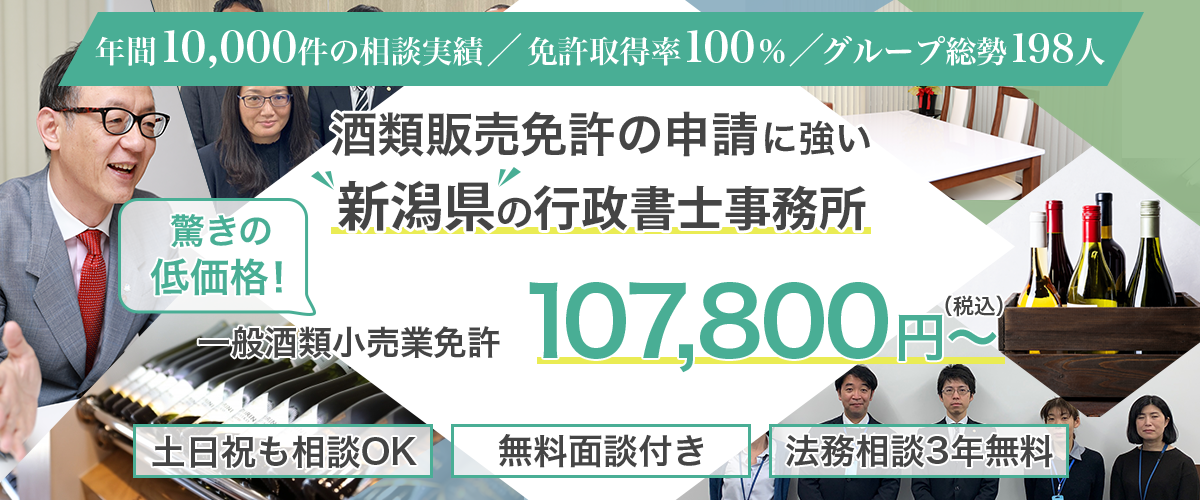 弊所、行政書士の高い知見とノウハウにより、新潟県全域のお客様の酒類販売の免許取得の成功率100%のご支援品質を維持しております。